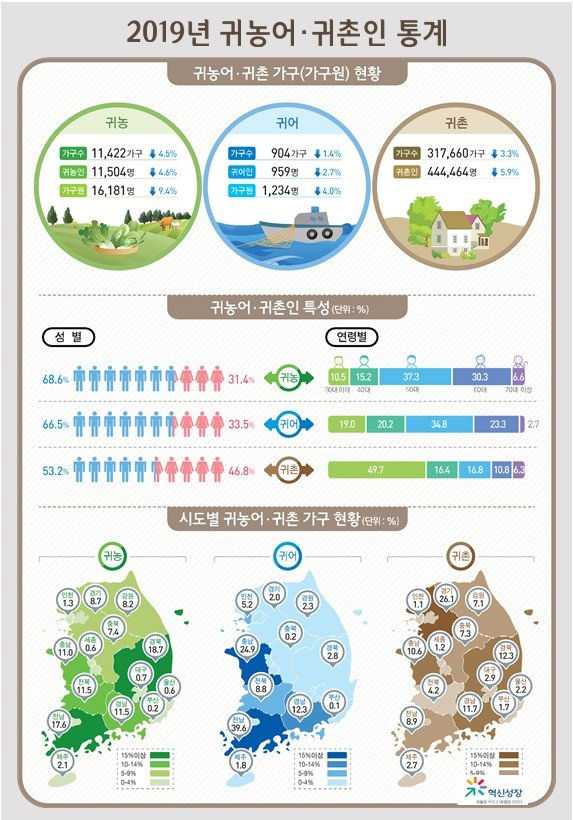 통계청과 농림축산식품부, 해양수산부는 25일 '2019년 귀농어·귀촌통계'를 발표했다. 통계에 따르면 지난해 도시 지역을 떠나 읍·면 단위 지역으로 이주한 귀촌가구는 31만7660가구로 2018년 대비 3.3% 감소했다. 귀촌인은 44만4464명으로 5.9% 줄었다.