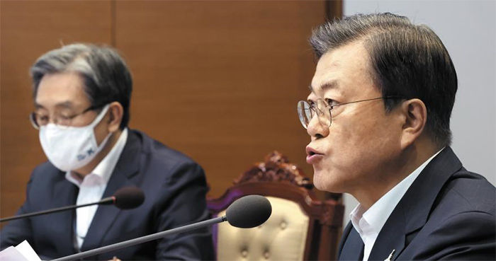 문재인(오른쪽) 대통령이 10일 청와대 수석보좌관 회의를 주재하고 있다. 문 대통령은 회의에서 “(부동산) 종합 대책의 효과로 주택시장이 안정화되고, 앞으로 이런 추세가 더욱 가속화되리라 기대한다”고 말했다. /연합뉴스