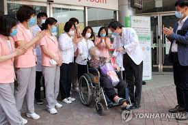 지난 3일 경북 안동의료원에서 신종 코로나바이러스 감염증(코로나19)에 걸려 99일 동안 입원한 80대 노인이 완치 판정을 받은 후 퇴원하고 있다. 80대 노인은 국내 최장기 코로나19 입원 환자이다. 연합뉴스