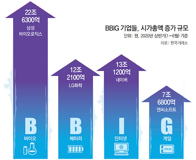 증시에서 자금이 몰린 곳은 삼성바이오만은 아니다. 6일 한국거래소에 따르면 상반기 동안 가장 큰 폭으로 시총이 늘어난 기업 10개는 모두 바이오(Bio), 배터리(Battery), 인터넷(Internet), 게임(Game) 업종이었다. 이른바 ‘BBIG’로 시장이 재편되고 있는 것이다. 재계 관계자는 “언젠가 바이오, 전기차 시대가 도래할 것으로 생각은 했지만 코로나19로 미래는 훨씬 빨리 현재가 되고 있다”고 말했다.